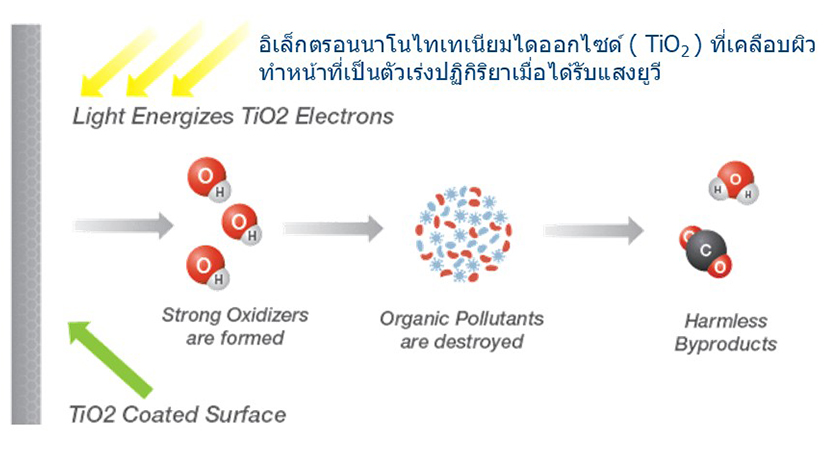 แสงยูวีทำงานร่วมกับแผ่นกรองโฟโตแคตาลิสต์ เร่งให้เกิดปฏิกิริยาโฟโตแคตาไลติกออกซิเดชัน หรือ PCO (Photocatalytic Oxidation) เพื่อทำลายพันธะโมเลกุลของสารประกอบอินทรีย์ ก๊าซพิษ และเชื้อโรค เช่น แบคทีเรีย ไวรัส เชื้อรา